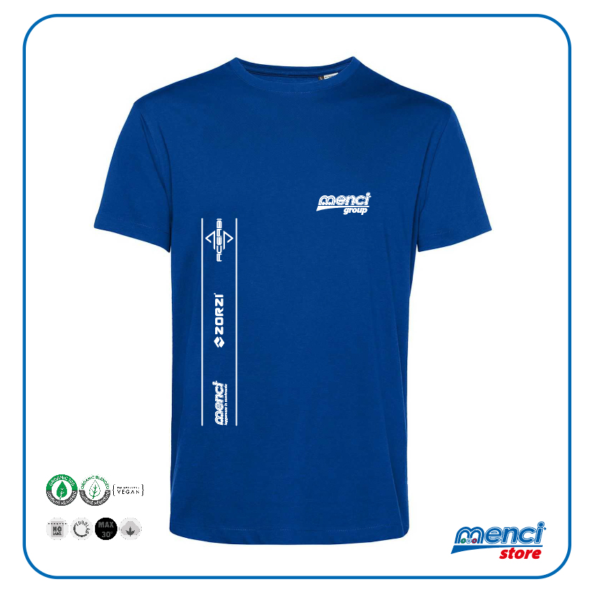 T-shirt unisex blu a girocollo con logo verticale Menci Group bianco.