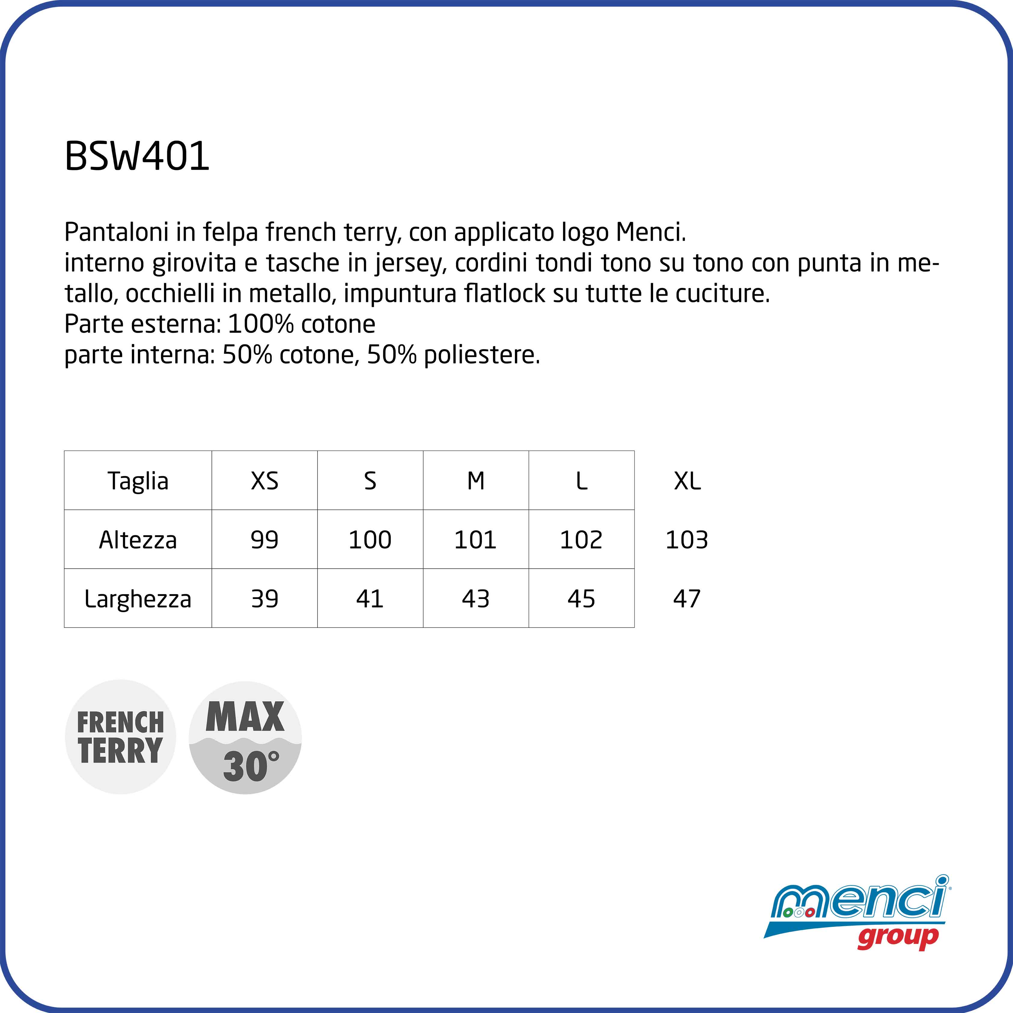 In felpa french terry, interno girovita e tasche in jersey, tasca posteriore applicata, fondo gamba a costine 1x1, cordini tondi tono su tono con punta in metallo, occhielli in metallo, impuntura flatlock su tutte le cuciture.